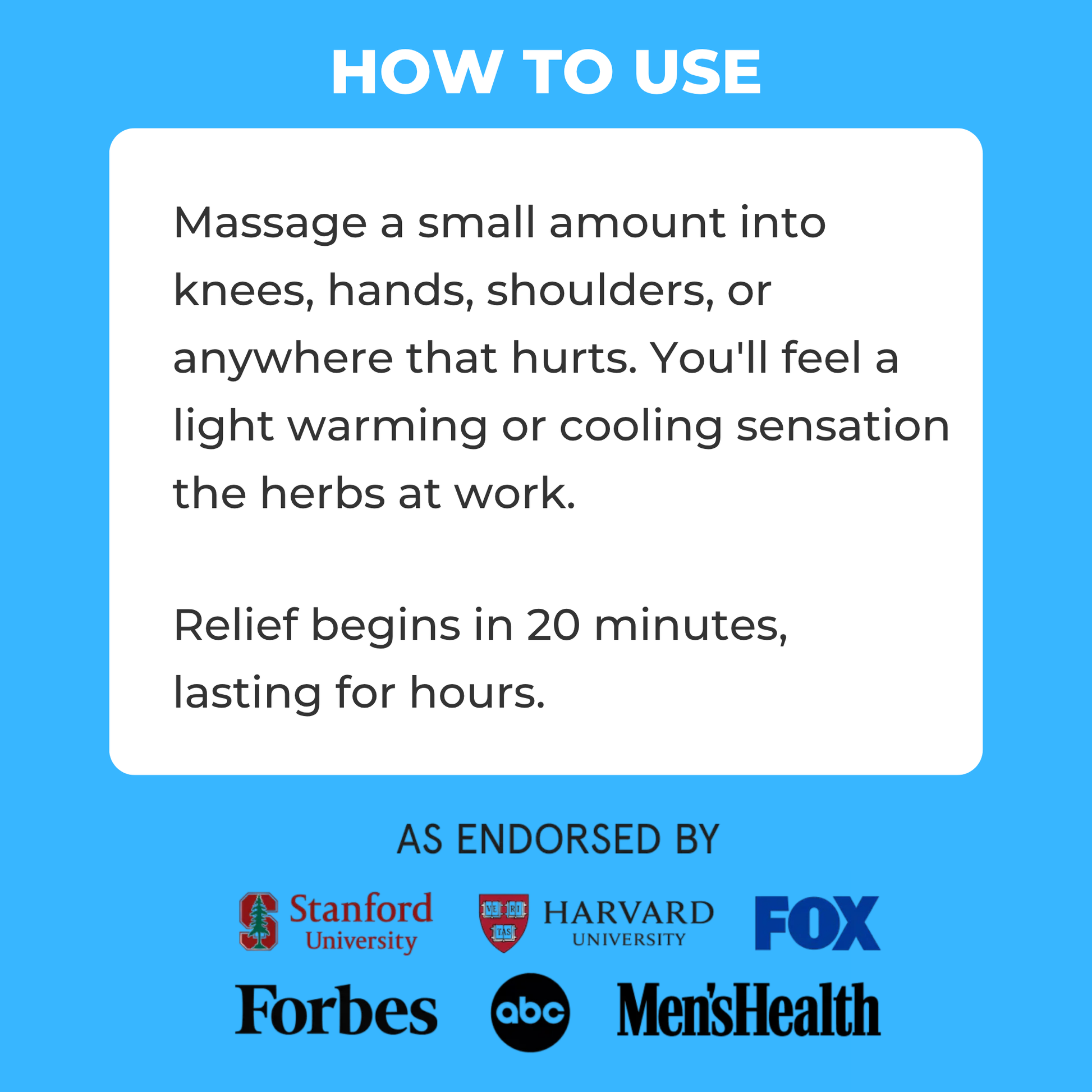 Use Freedom Balm consistently for 90 days. If you're not back to doing at least 3 activities you'd given up due to pain, return even the empty jars for a full refund.