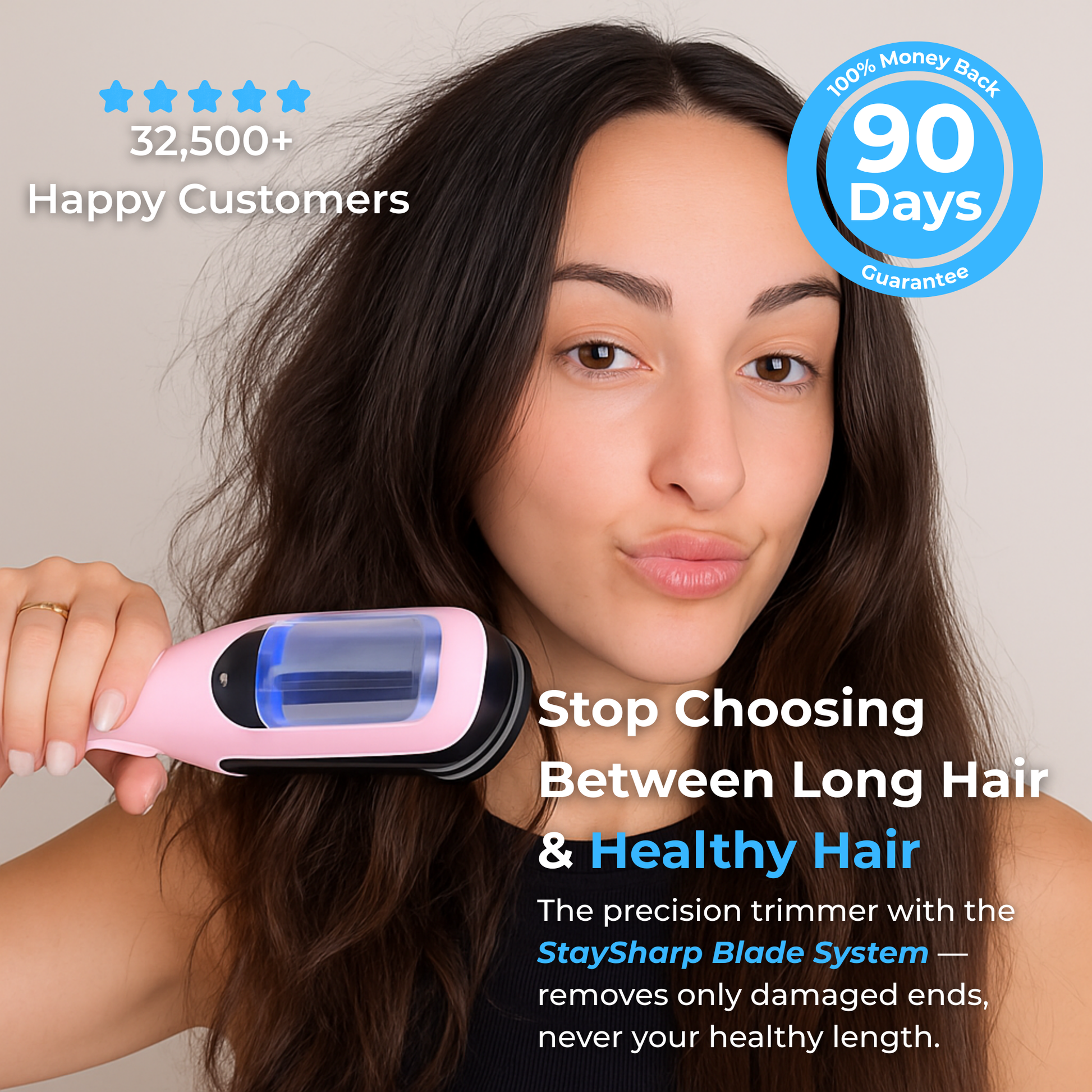 That's exactly why we created the StaySharp Blade System™. Unlike cheap trimmers with dull blades that tear hair, our precision Japanese steel creates clean cuts that actually prevent future splitting.